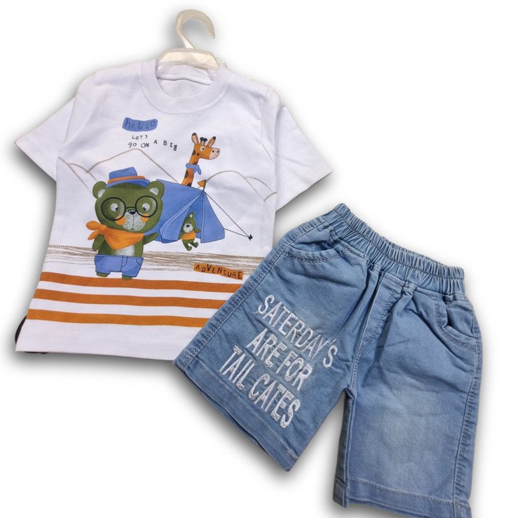 ست تیشرت و شلوارک جین بچهگانه پسرانه طرح خرس و زرافه جنس سوپر نخ و پنبه