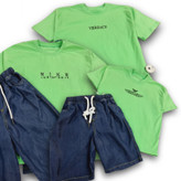 تیشرت وشلوارک جین یونیسکس جنس تیشرت سبز سوپر نخ وپنبه و شلوارک جین کاغذی مناسب 4 تا 14 سال