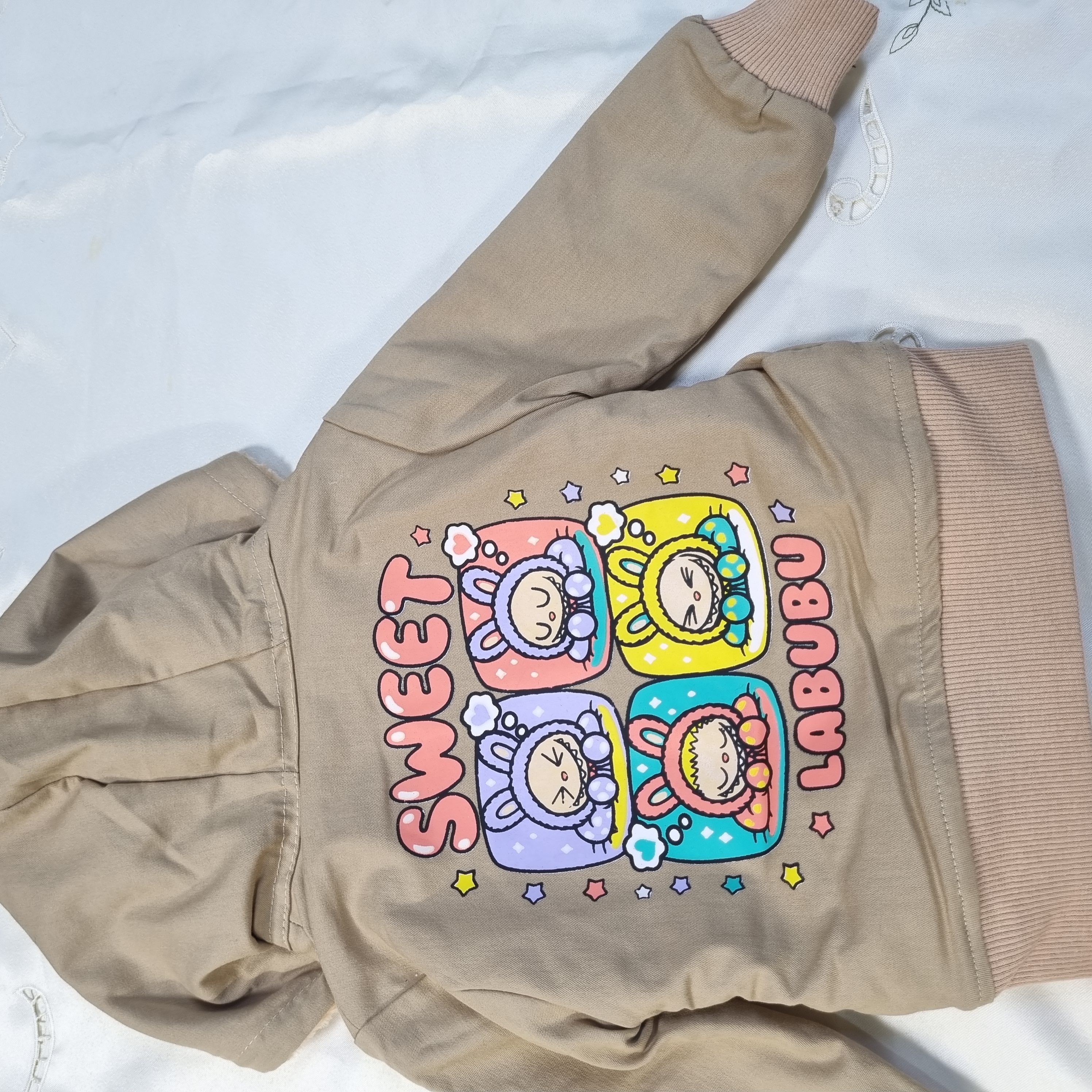 طرح LABUBU پر از رنگهای شاد: با چاپهای جذاب و رنگارنگ از شخصیت محبوب لبوبو (LABUBU) در قسمت جلو و پشت سویشرت، که لبخند را بر لبان کودکان میآورد.